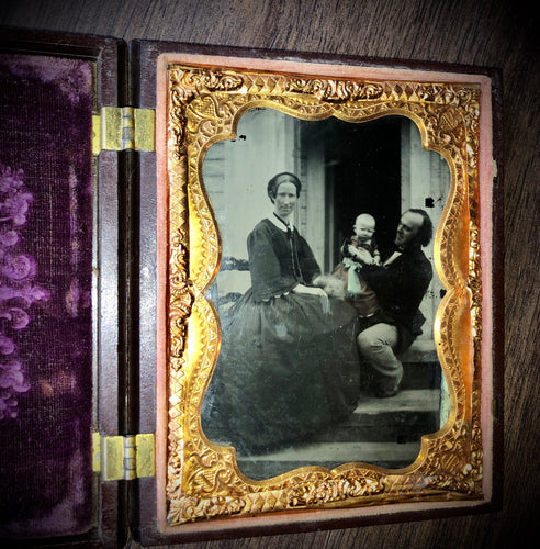 1/4 Ambrotype in Union Case Family on Porch of House with Dog / 1850s Photo