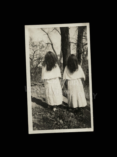 old snapshot photo girls long black hair backs to camera - creepy witch sisters