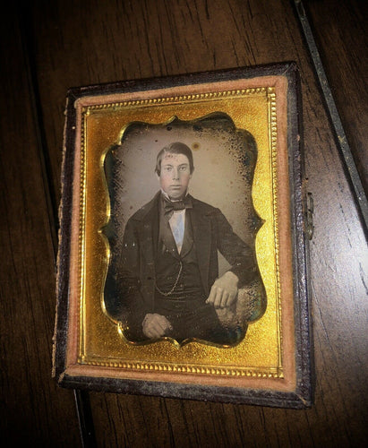 Sealed 1/9 Daguerreotype Young Man In Suit, Painted Gold Watch Chain