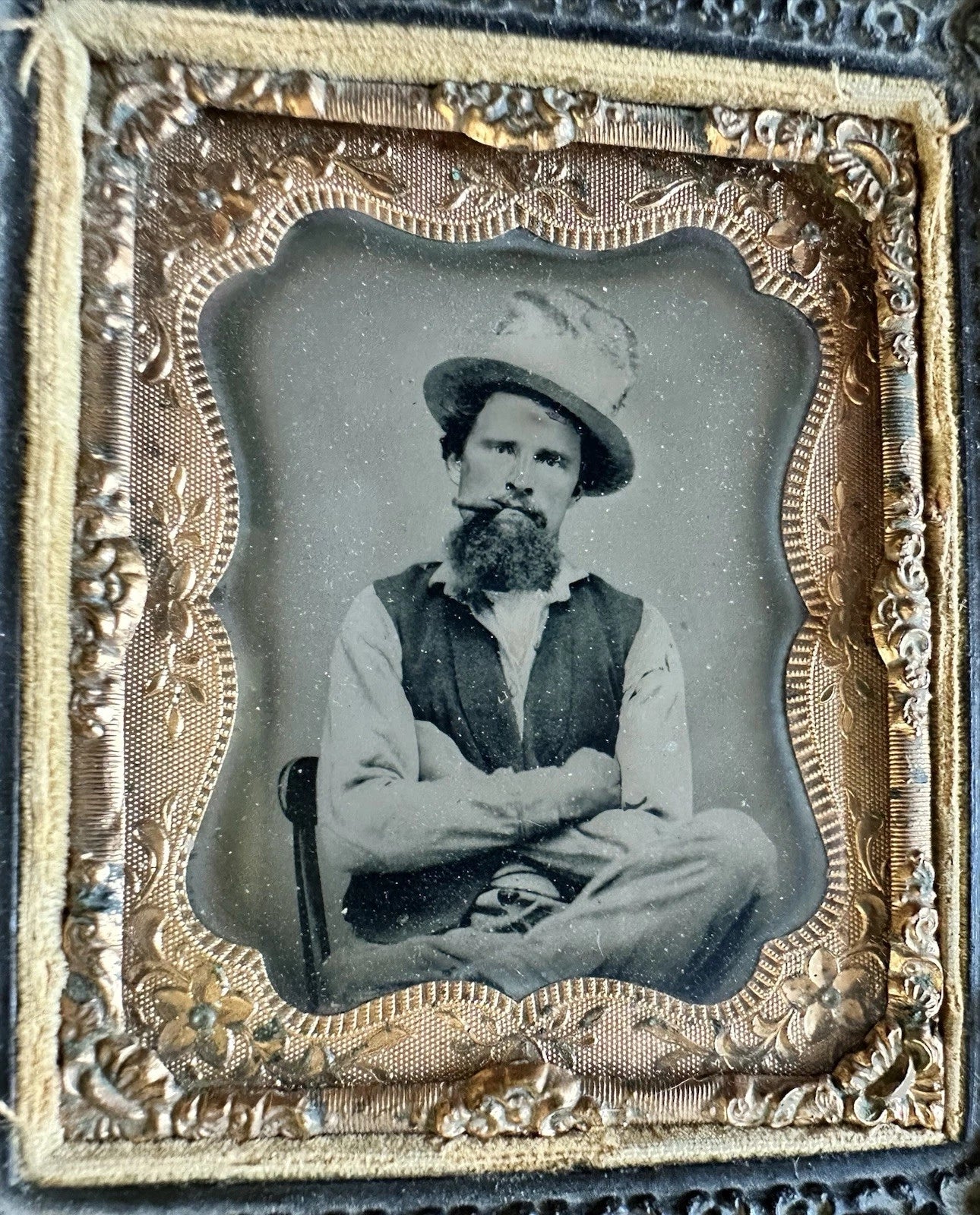 The original wall frame has some chips and a couple of minor cracks. Frame measures a shade under 4" x 3.5"; the tintype itself is 1/9 plate.