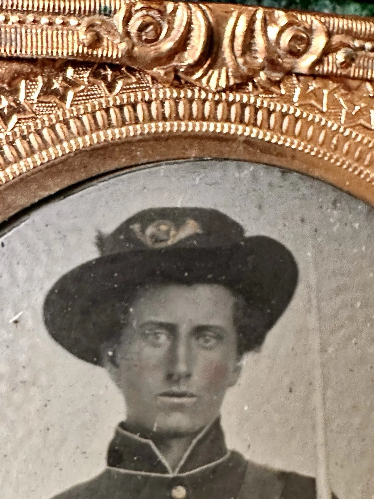 Tintype is in a good union case, pad is loose. It is behind mat BUT THERE IS NO COVER GLASS. Tintype is very good with no bends, and a few light mat abrasions.