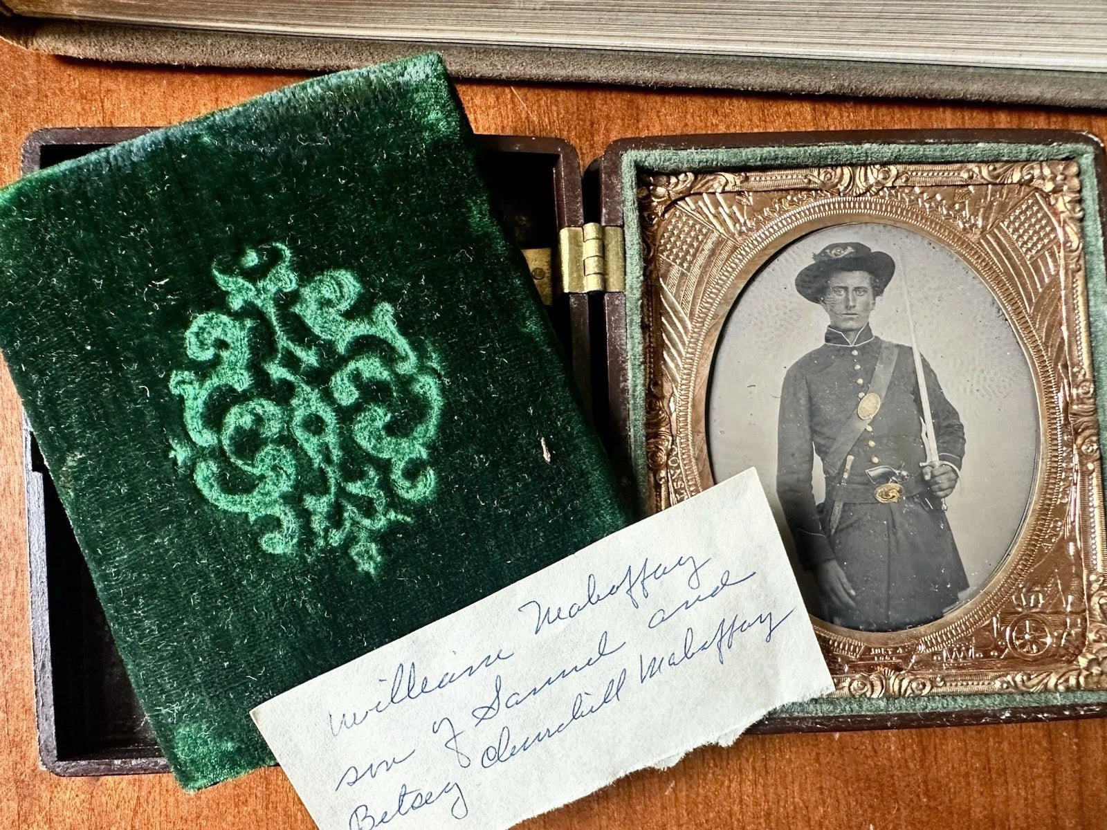 1/6 tintype of an identified soldier, "William Mahaffay, son of Samuel and Betsey Churchill Mahaffay". Mahaffay was born in 1843 and died of disease in 1863. Apparently there was some mix-up with his burial and an unknown soldier was buried as Mahaffay at Oak Hill Cemetery in Illinois.. but Mahaffay is actually buried at Stones River National Cemetery in Tennessee.. see picture 2 (source: FindAGrave). You can find his memorial on FindAGrave at Stones River, as William MahaffEy.