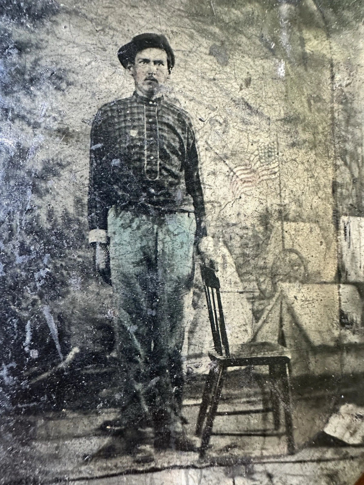 Original quarter-plate tintype, uncased, with some light bends and surface wear as shown. Worn surface but no flaking.