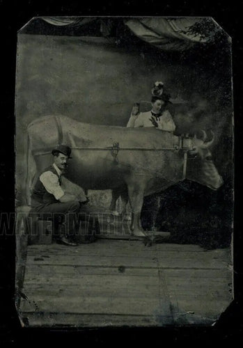 Unusual Tintype Photo Man & Woman Milking a Prop Cow