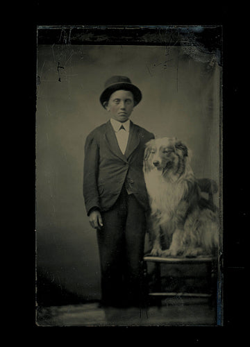 great 1870s tintype photo boy & his well behaved collie type dog in chair
