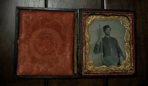 1/6 Tintype Armed Civil War Soldier Holding Rifle, Tinted Zouave 1860s Photo