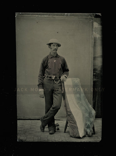 Excellent Antique Tintype Photo Handsome Fireman with Tinted US Flag or Bunting