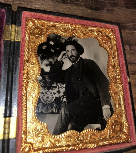 Excellent Civil War Era Tintype Photo Handsome Casual Man Beard & Flowers 1860s