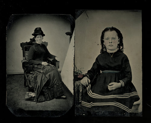 Very Nice Tintype Photos Woman Next to Reflecting Screen & Girl w Tinted Flowers