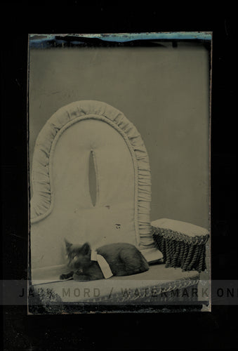 Cat or Kitten in Chair Wearing White Bow! Rare 1870s Tintype Photo