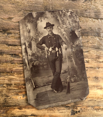 A+ Antique Tintype Photo Western Hunter / Cowboy Armed w Rifle Revolvers & Knife
