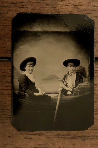 Antique / 1800s Tintype Photo Two Girls Young Women Rowing A Prop Boat - EXCOND!