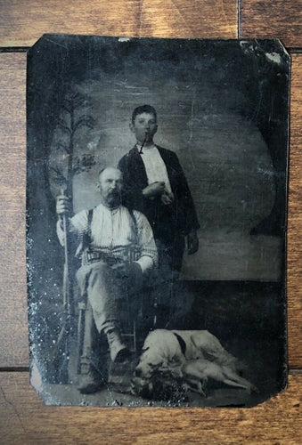 Antique Tintype Photo Men w Rifle & Hunting Dogs & Rabbits!