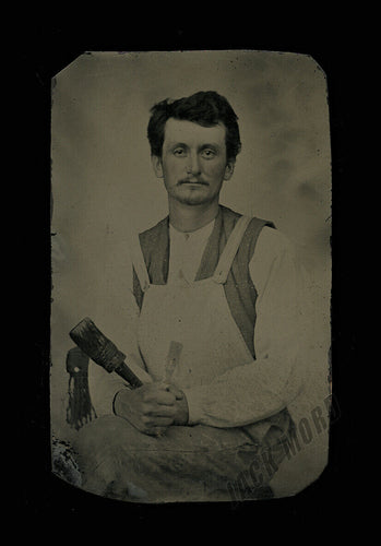 Old 1800s Occupational Tintype Photo Painter In Work Clothes Holding Brushes