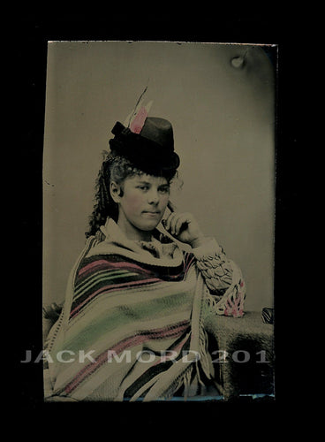 Antique Tintype Photo of Girl Wearing Hand Tinted Wrap & Color Feather in Hat
