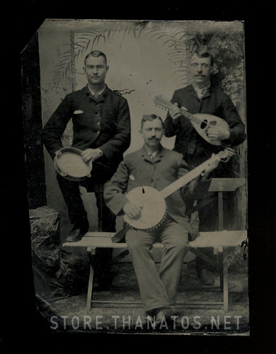 vintage antique 1800s tintype of musicians banjo tambourine mandolin players!