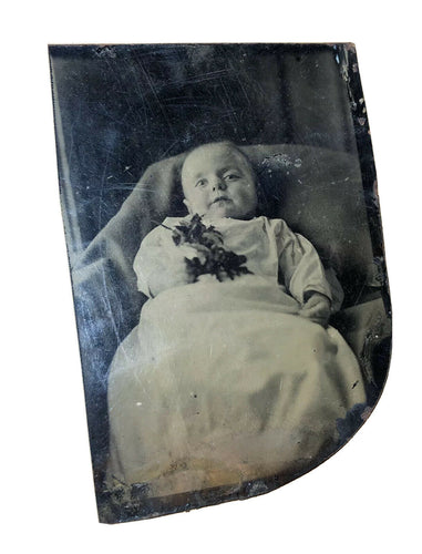 post mortem tintype child holding flowers / open eyes 1860s c1870