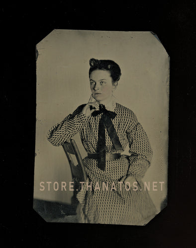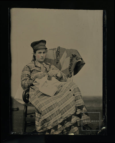 1800s Tintype Photo Woman in Unusual Hat & Dress Crocheting or Sewing