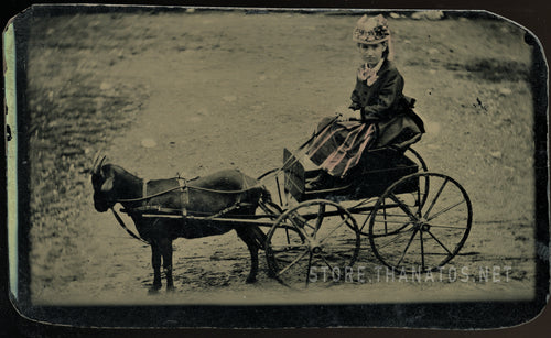 1870s Tintype Girl in Tinted Pink Dress Being Pulled by Black Goat! 6212