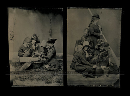 Great Set of Tintype Victorian Girls Having Picnic, Fishing, One Hidden Face