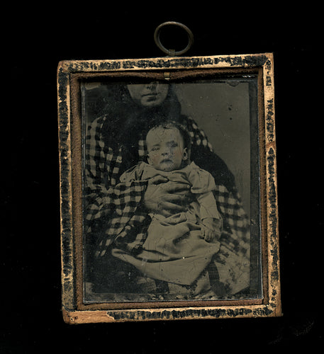 Tintype Partially hidden mother in checked dress holding baby hanging Frame