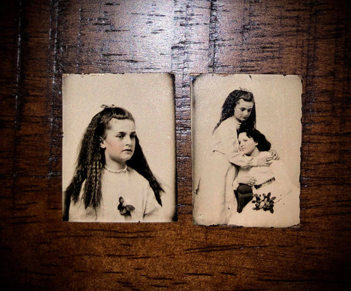 Two Miniature 1860s Gem Tintype Pretty Girls with Long Hair, Affectionate Pose