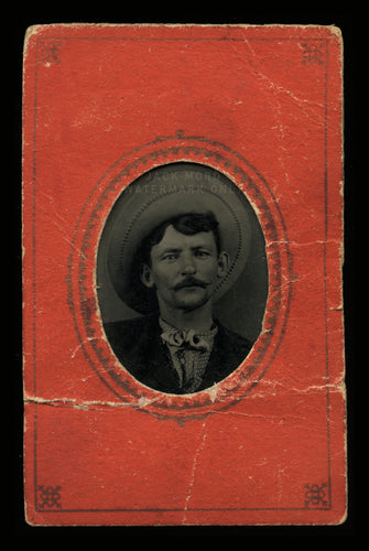 antique 1800s tintype photo of curled mustache man, big cowboy hat fills frame