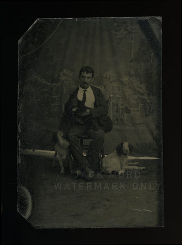 Tintype Man Posing with Three Dogs - One Very Unruly