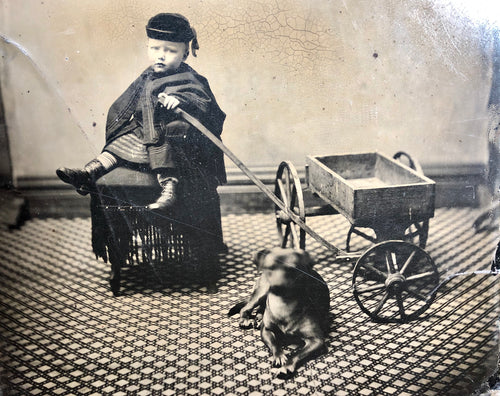 Large Full Plate Tintype Little Boy, Toy Wagon & Dog
