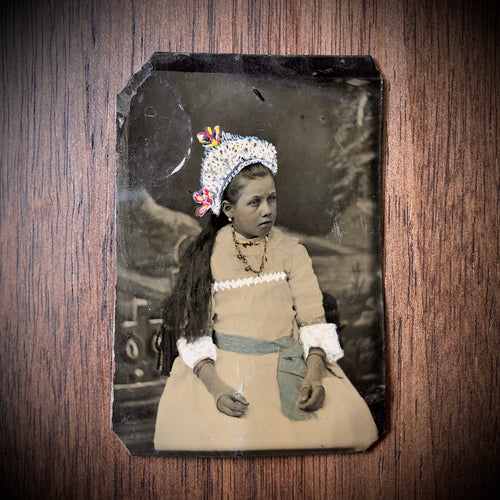 Wonderful Tintype Girl with Hand Painted Hat & Accents - Folk Art Style