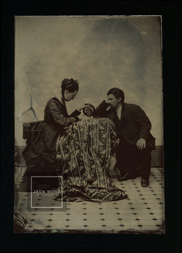 Rare 1860s Tintype Photo Woman Using Sewing Machine as Man Watches Seamstress