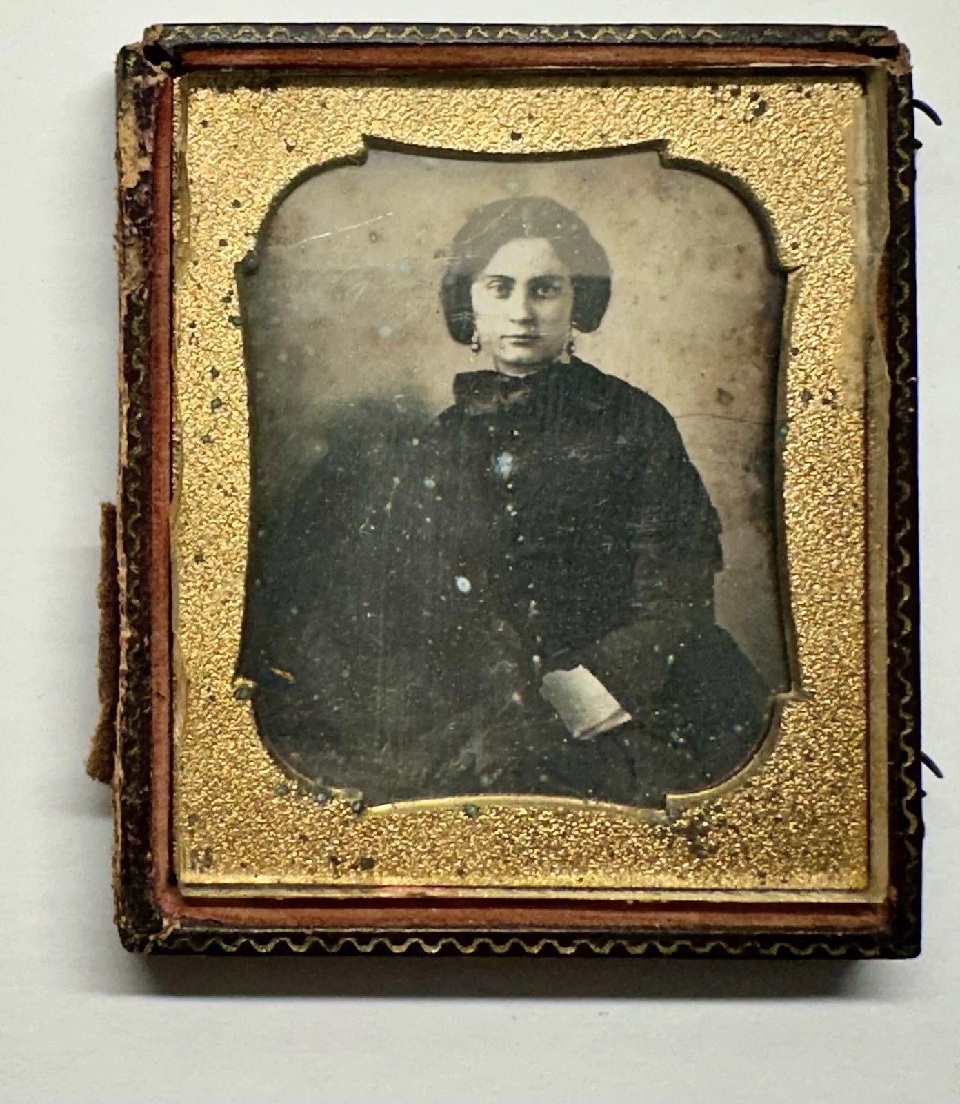 Sixth-plate late-1840s daguerreotype in half of a case. Woman who was originally holding a small child or possibly a child standing next to her, that was deliberately scratched out of the image at some point. Overall this unsealed dag is in fair to good condition with tarnish and scratches. The cover glass and mat will fall out if turned face down.. should be taped / sealed together when possible.