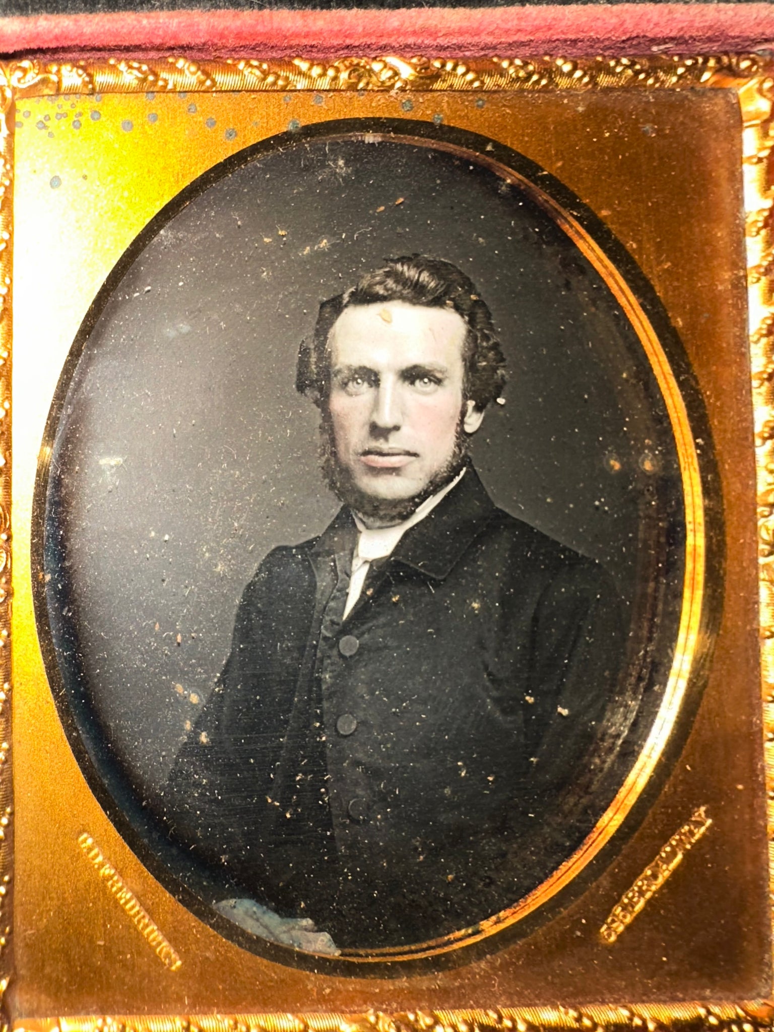 6th plate dag of a bearded man by Charles Fredricks, NYC. The dag's original seals are still intact and it's in a full case, with separated covers. Tarnish ring, otherwise in excellent condition. The spots are on the underside of the glass but since the seals are intact I did not clean them off.
